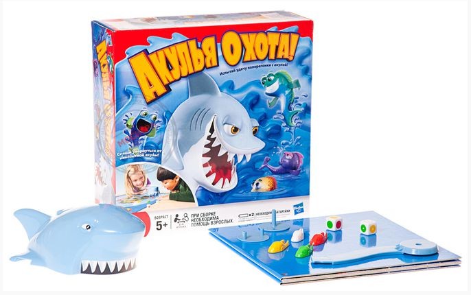 Настільна гра Акулье полювання буде цікавим дітям від 5 років. Одночасно рятуватися від акули зможуть від 2 до 4 мальків. Перед початком партії розмістіть ігрове поле на рівній поверхні, підклавши під поле пластиковий диск з двома штирьками, а потім протягніть ці штирі у відповідні отвори в центрі поля. Інший диск опустіть на ігрове поле зверху так, що верхні та нижні штирі збіглися. Тепер закріпіть важіль, щоб його круглий кінець знаходився на штирку, що виступає. Ну, і справа за малим – засуньте важіль у пази, тим самим прикріпивши його до акули.