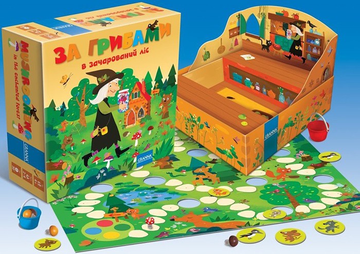 За грибами – проста дитяча гра. Все що потрібно робити: кидати кубики і пересувати свою фішку по полю на кількість кроків, що випало. По дорозі ви, звичайно, зустрінете безліч лісових тварин, зберете кошик грибів, а може навіть потрапите в хатинку відьми. Але не переживайте, від неї можна відкупитися (до речі, це відмінний спосіб позбутися поганок, які забирають переможні очки в кінці гри). Ну а переможцем стане той, хто збере на шляху найбільше грибів. Гра чудово оформлена, в ній багато яскравих мультяшних жетончиків, дуже милі об'ємні грибочки, які можна складати в чудові маленькі кошики, а їх коробки виходить справжня хата відьми.