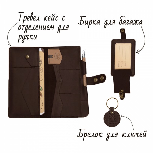 - тревел-кейс, бирка для багажа, брелок, открытка, крафтовая коробка.