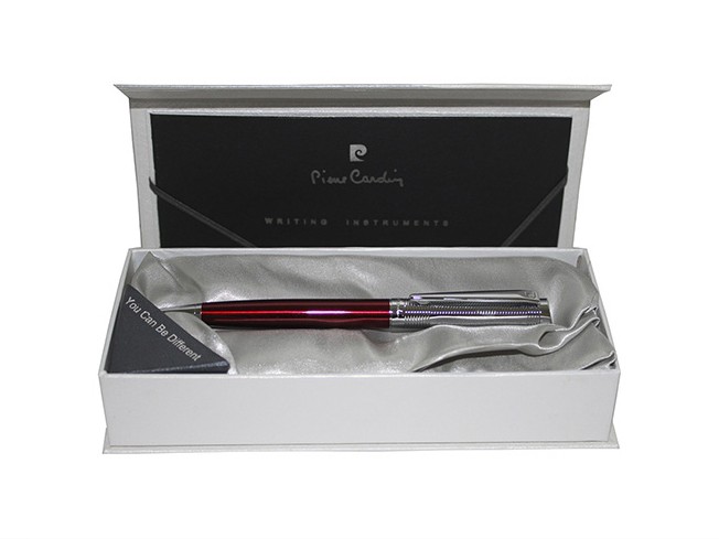 Кулькова ручка Pierre Cardin CRESCENT PC5082BP виконана з латуні, покрита акриловим лаком глибокого червоного кольору, а ковпачок - з сріблястого металу з дрібною насічкою. Примітно, що на ковпачку є напис "в'яззю" Pierre Cardin і місце під гравіювання прямокутної форми 3.5х0.7 см. Завдяки поворотному механізму, ручка прослужить своєму власнику дуже довго. Дозволяє писати до 600 сторінок формату А4 завдяки стрижню Pierre Cardin з великим обсягом.