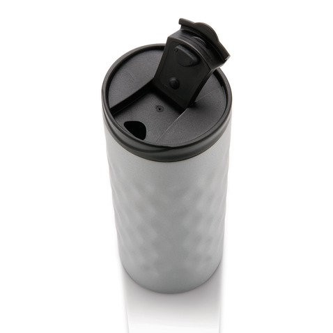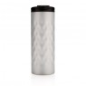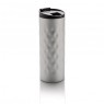 Герметичний термостакан з подвійними стінками, виготовлений з нержавіючої сталі, має дуже стильний оригінальний дизайн, що приваблює строгою геометрією форм і металізованим сріблястим забарвленням.