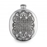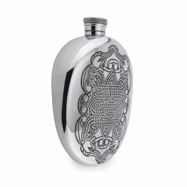 Справжньою родзинкою колекції фляг від англійської компанії English Pewter можна назвати серію олов'яних виробів овальної форми. Така олов'яна посудина – це фактично традиційний аксесуар до шотландського національного костюма. Його прийнято носити у спеціальній поясній сумці, яка називається спорран. Модель CEL130 прикрашена незвичайним малюнком міфічних істот з геометричними візерунками в кельтському стилі. Такий сувенір відмінно підійде як подарунок для ваших рідних та близьких людей. Якщо ви вирішите купити флягу, то на додаток до неї отримаєте чохол для фляги, лійку, за допомогою якої можна наливати спиртні напої, і фірмову коробку бежево-чорного кольору.