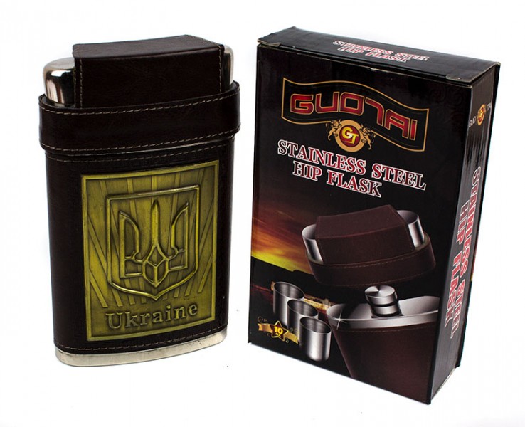 Характеристики товару Фляга з нержавіючої сталі обтягнута шкірою Україна + чарки