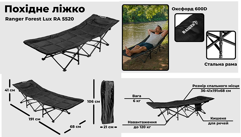 Новітня вдосконалена розкладачка Forest Lux – модель, яка увібрала в себе усе найкраще з попередниці Military Forest та коропових ліжок – м’який наповнювач та подушку. Виїжджаючи на природу на кілька днів, варто подбати про ночівлю. Спати на траві, напевно, романтично, але не комфортно. Розкладачка – найкраще рішення для Вас! Тим більше, що таку розкладачку-ліжко можна поставити як під відкритим небом, так і в наметі. Вона розкладається дуже швидко та легко, сам процес займе не більше 5 секунд. Необхідно просто від’єднати ремінь та надавити рукою посередині. Шість ніжок конструкції роблять розкладачку дуже стійкою, аби ніжки не роз’їжджалися, вони додатково стягуються між собою ременем. Металева розкладачка Ranger Forest Lux витримає до 120 кг. Темно-сірий привабливий колір дуже приємно та гармонійно виглядає під час відпочинку та не так сильно брудниться.М’який наповнювач ліжка товщиною 1,5 см заміняє матрац і більше немає потреби додатково класти щось для пом’якшення. Завдяки матрацу набагато приємніше і тепліше стає користування ліжком. У підголівнику розташована м’яка подушка товщиною в 6 см. Придбавши розкладачку Forest Lux, ви отримуєте повноцінне, м’яке та зручне ліжко. Додатково передбачена кишеня для зберігання дрібних речей, а саме мобільного телефону, ключів, запальнички тощо.