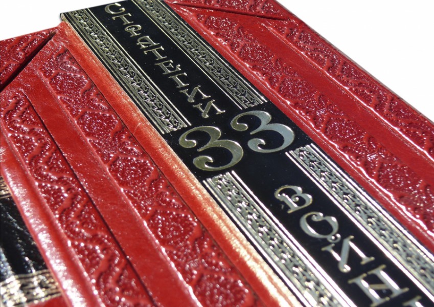Французька складова палітурка ручної роботи виконана з комбінації натуральних шкір (шкіра теля «Robbat rosso», шкіра «Robbat nero» виробництва італійської шкіряної фабрики Carisma»). Обкладинка книги оформлена комбінацією багаторівневого об'ємного тиснення: рельєфного золотого з використанням фольги «Luxor 240» та глибокого блінтового. Обріз вручну полірований і позолочений сусальним золотом.