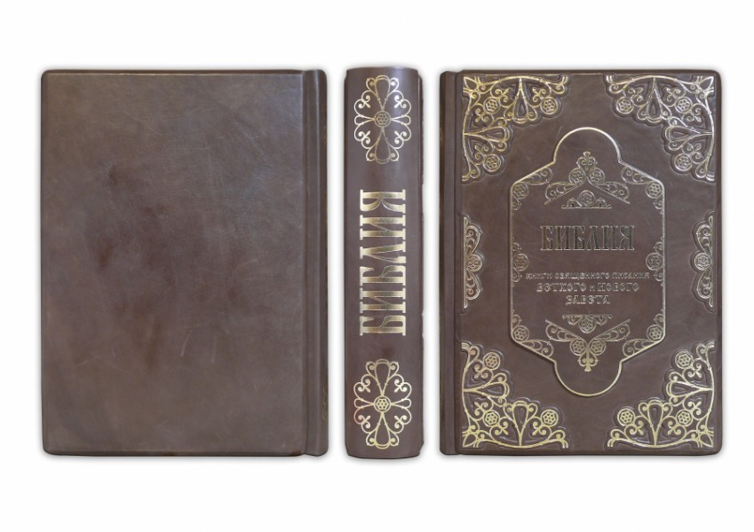Французька складова палітурка ручної роботи, виготовлена з натуральної шкіри «MarroneCioccolato» виробництва італійської шкіряної фабрики «Carisma». Обкладинку книги оформлено в авторській техніці «рельєфне тиснення за об'ємними візерунками». Обріз полірований і позолочений сусальним золотом з пошуковими індексами.