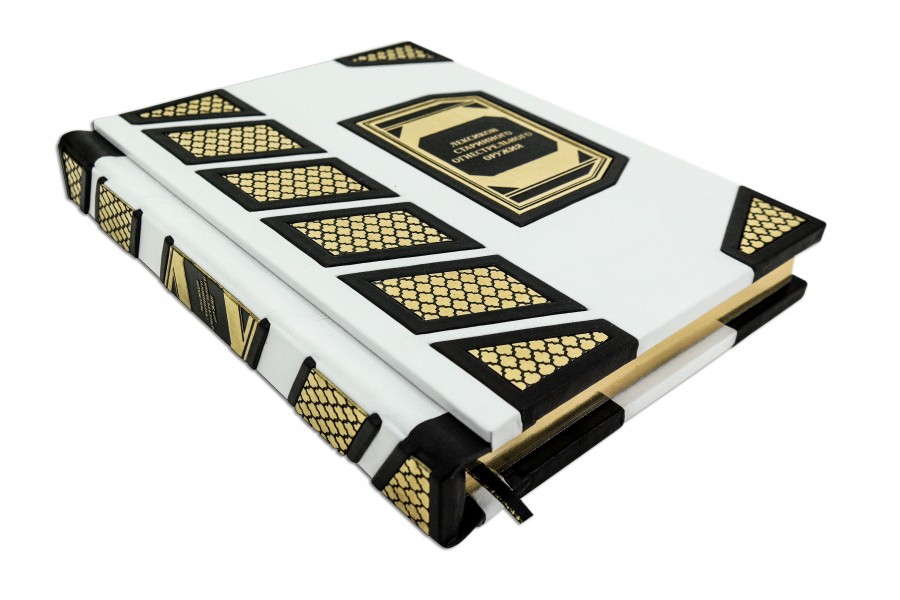 Складна обкладинка ручної роботи «Брадель» обкладинка виконана з комбінації натуральної телячої шкіри (шкіра «bianco», шкіра «nero») виробництва італійської шкіряної фабрики «Carisma». Двохрівнева обкладинка книги оформлена композицією з художнього травлення латуні. Складовий форзац із принтом на полотні, на шкіряній слизурі. Шкіряний каптал та шовкова стрічка-лясе. Обріз книги вручну полірований та позолочений сусальним золотом.