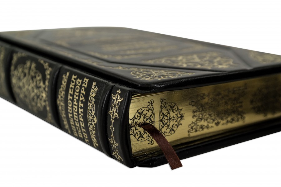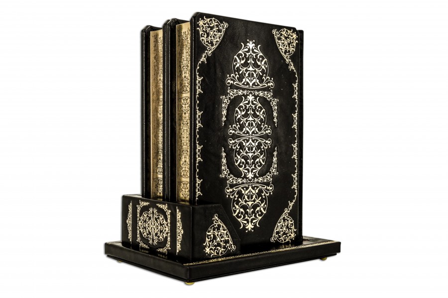 Французька складова палітурка ручної роботи виконана з натуральної шкіри «Scarlett Brown» виробництва італійської шкіряної фабрики «Benericetti». Обкладинка книги оформлена об'ємними візерунками ручного тиснення, рельєфним золотим тисненням із використанням фольги «Luxor 240». Обріз книг позолочений та декорований вигравіруваним візерунком. Підставка виконана в тому ж стилі, що книги.