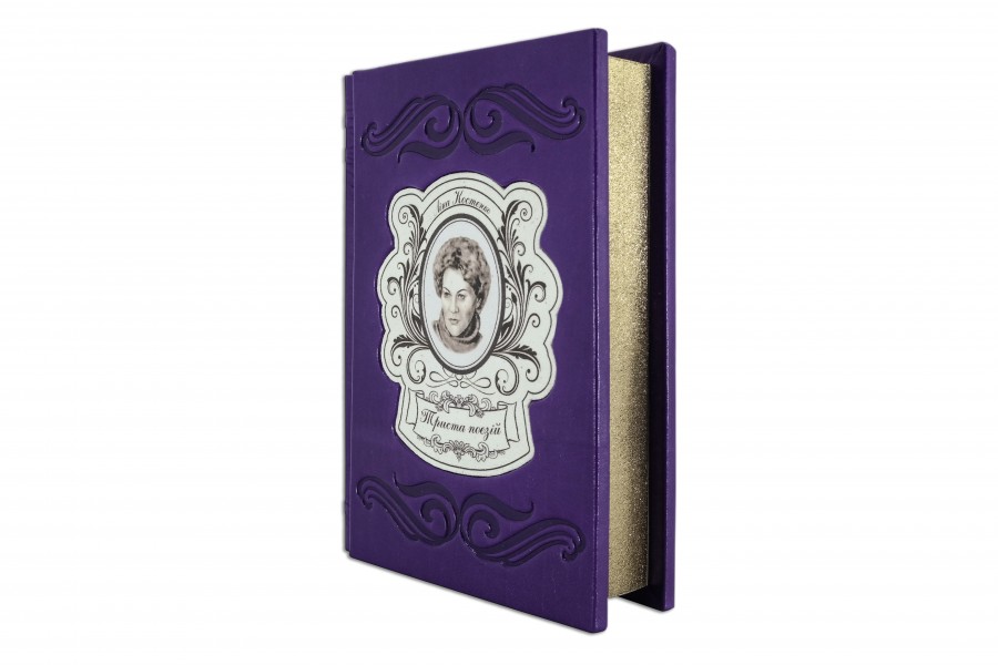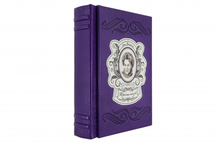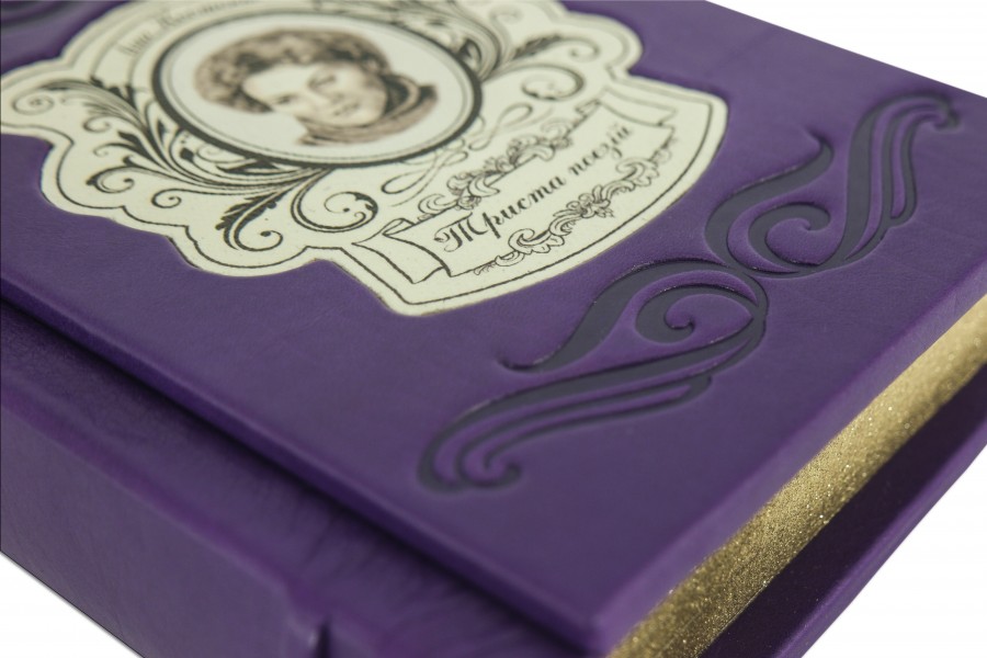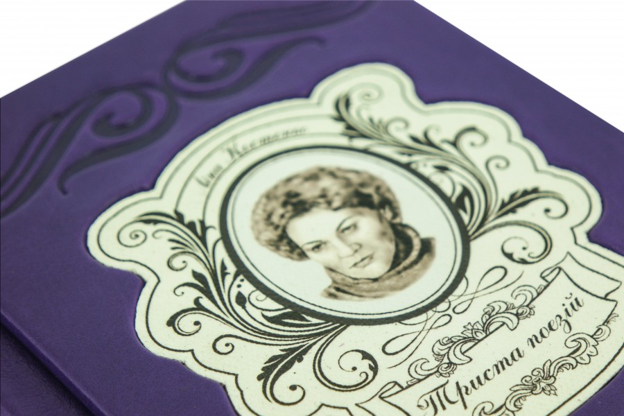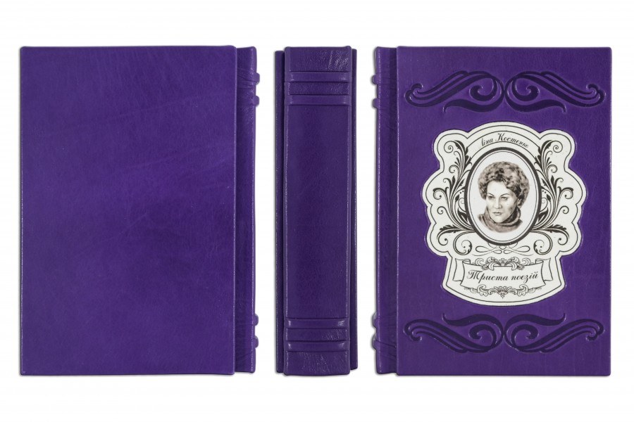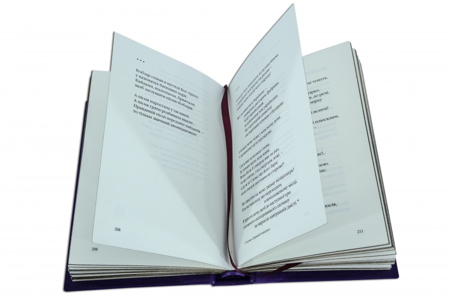 Французька складова палітурка ручної роботи виконана з натуральної шкіри теля "Porpora" виробництва італійської шкіряної фабрики "Claudio". Обкладинку книги оформлено глибоким блинтовим тисненням та декоровано вставкою з полотна з художнім принтом. Обріз книги вручну Шліфований та позолочений сусальним золотом.