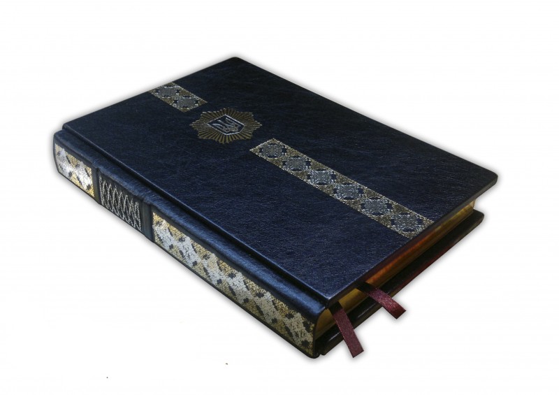 Французька складова палітурка ручної роботи виготовлена з натуральної шкіри теля «blu metallizzato» виробництва італійської фабрики «Carisma». Обкладинка щоденника оформлена рельєфним тисненням із комбінації золотої та срібної фольги. Обріз блок золотий. Надруковано в друкарні «Bruno Visconti», Італія.