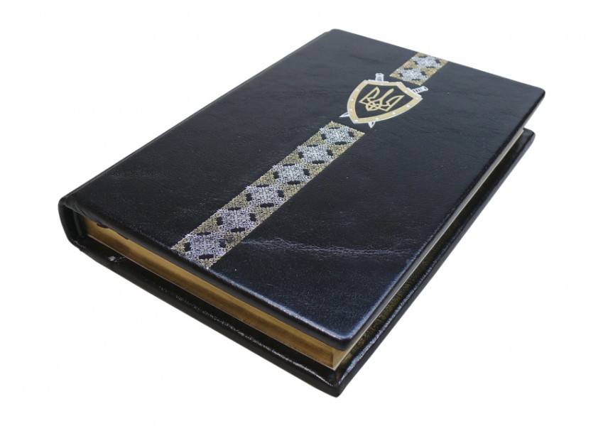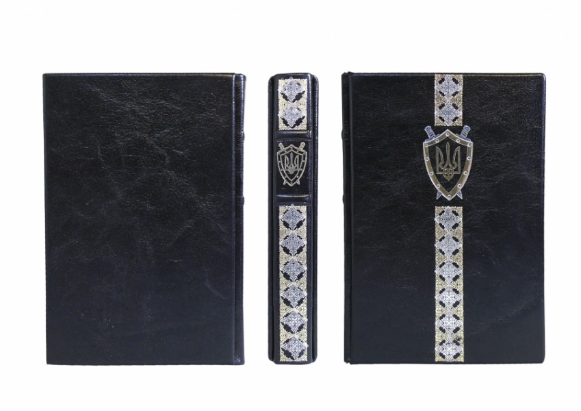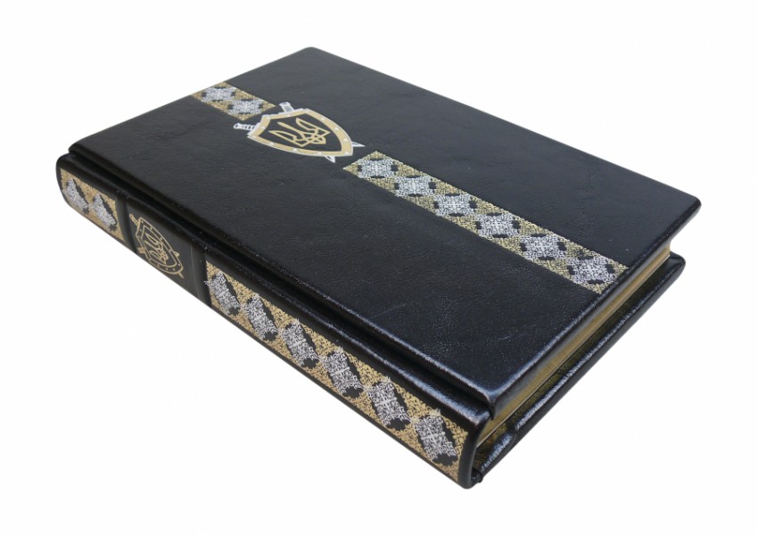 Французька складова палітурка ручної роботи виготовлена з натуральної шкіри «Plonge Brown» виробництва італійської фабрики «Claudio». Обкладинка щоденника оформлена рельєфним тисненням із комбінації золотої та срібної фольги. Обріз блоку вручну полірований та позолочений сусальним золотом.