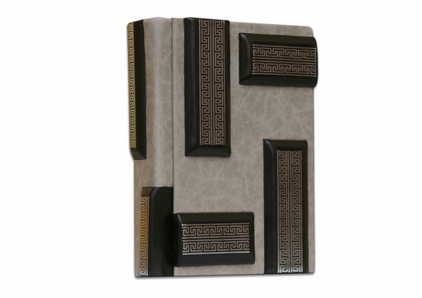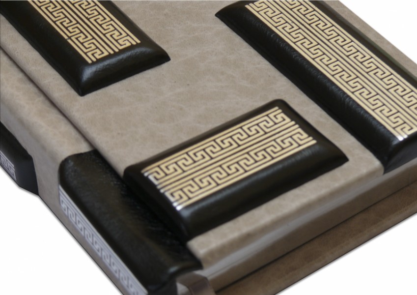 Французька складова палітурка ручної роботи виготовлена з комбінації натуральних шкір (шкіра теля «Robbat nero», шкіра теля «Marmo chiaro» виробництва італійської шкіряної фабрики «Benericetti»). "Luxor 240". Обріз блоку вручну полірований і срібний сусальним сріблом.