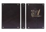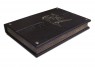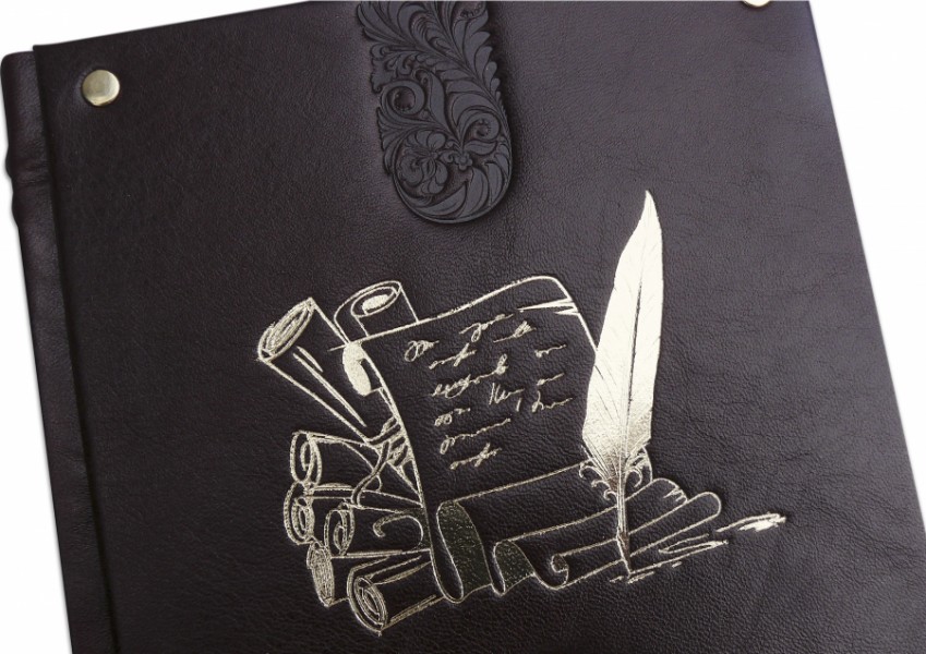Французька складова палітурка ручної роботи виготовлена з натуральної шкіри теля «Marrone» виробництва італійської шкіряної фабрики «Benericetti». Обкладинка оформлена рельєфним золотим тисненням, з використанням фольги «Luxor 240», та глибоким блінтовим. Декорована холітенами, колір голд, кількістю 10 штук. Обріз блоку вручну полірований та позолочений сусальним золотом.
