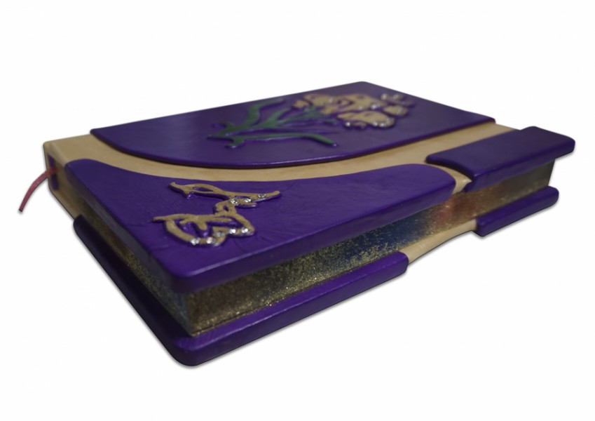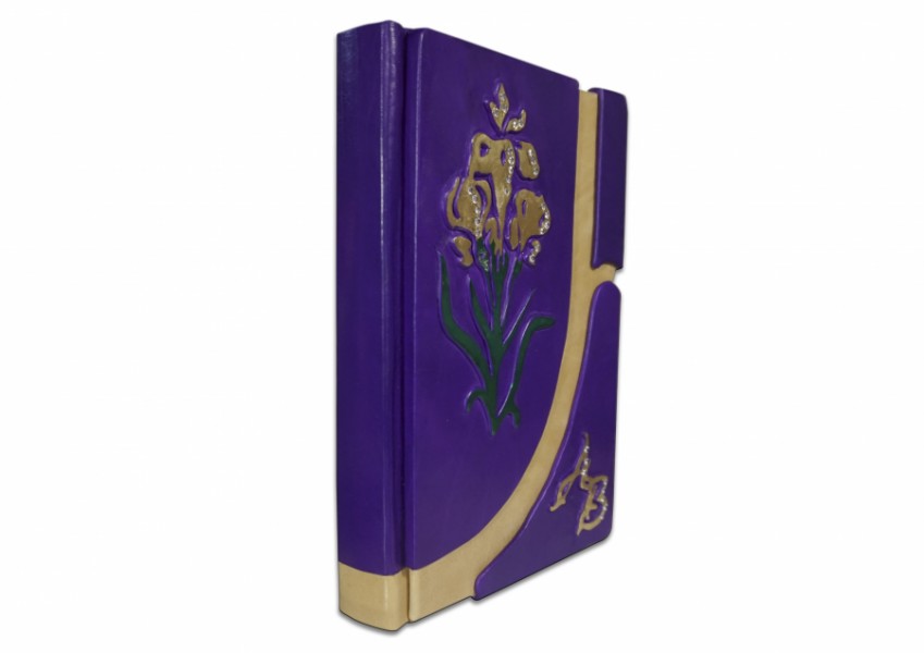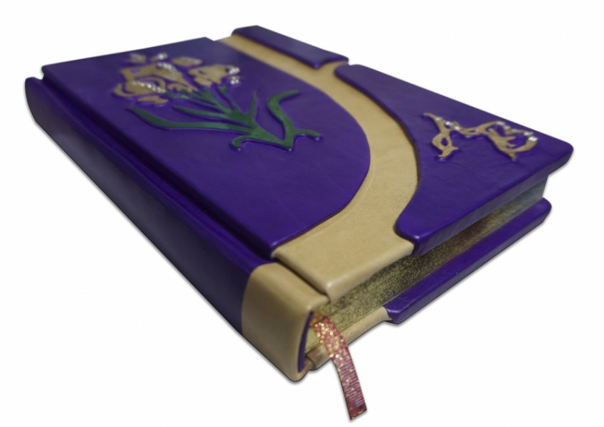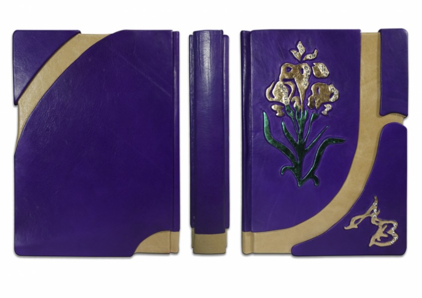 Французька складова палітурка ручної роботи виготовлена з комбінації натуральних шкір (шкіра теля «beige», шкіра «porpora» виробництва італійської шкіряної фабрики «Benericetti»). Дворівнева обкладинка, оформлена об'ємними візерунками ручної продавки, позолоченими вручну сусальним золотом, з використанням фольги «Luxor 240». Інкрустована камінням Swarovski, колір прозорий, кількістю 32 штуки. Обріз блоку вручну полірований та пофарбований у техніці хамелеону.