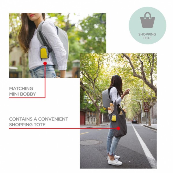 - вместительная сумка Bobby Mini для покупок, которая складывается в миниатюрную версию рюкзака Bobby.