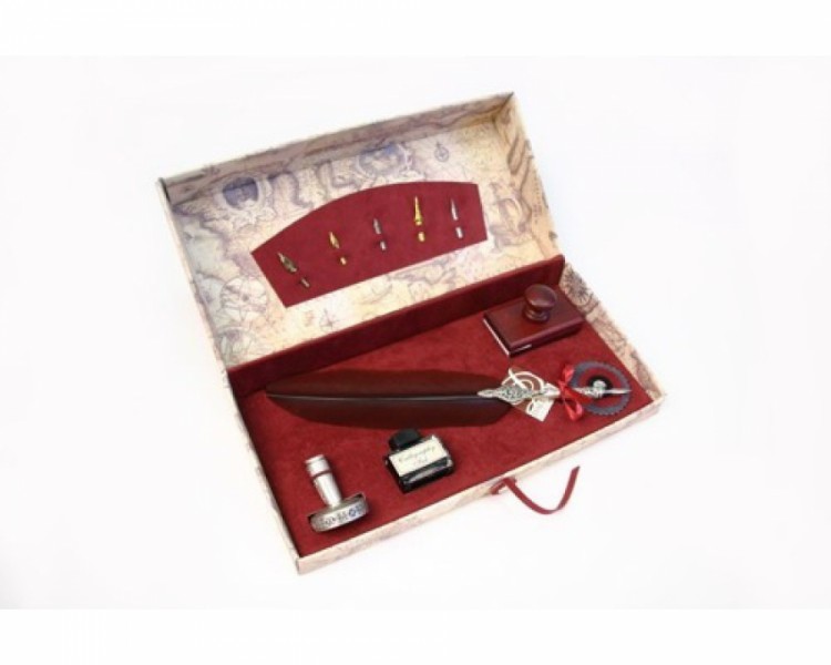 Набір упакований в елегантний футляр з приємним оксамитовим покриттям, що надає розкоші та унікальності вибраного набору. Перо закріплене тонкою атласною стрічкою, що точно підходить у тон.