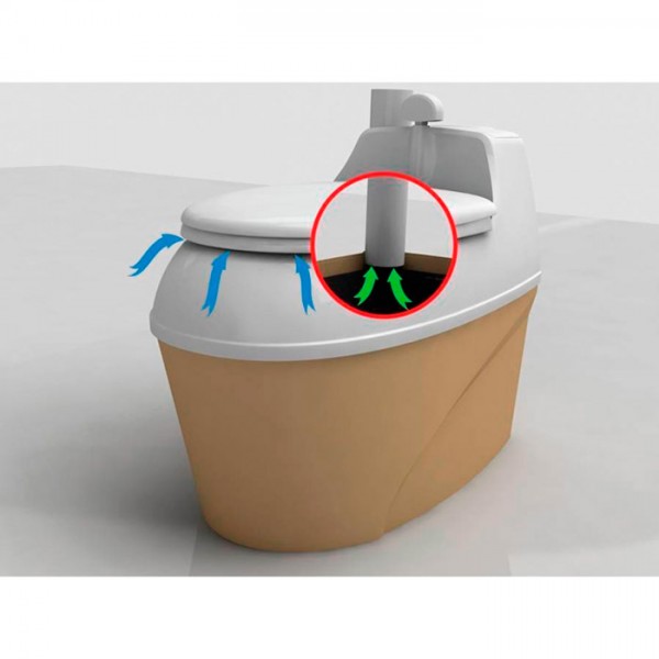 Вентиляційна система туалету дозволяє усунути всі неприємні запахи завдяки прямоточному вентиляційному стояку, що виводить газоподібні продукти компостування безпосередньо із накопичувальної ємності в атмосферу. У накопичувальній ємності є три ручки для виймання: дві з обох боків і одна ззаду, ручки мають ергономічні пластикові ніші. За допомогою цих ручок здійснюється транспортування накопичувальної ємності до місця спорожнення.