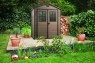 У садовому будиночку SCALA 6x5 розмістяться не тільки садові інструменти, але й інструменти та предмети, необхідні у домашньому господарстві. Виріб виготовлений із високоякісного пластику, завдяки чому він не іржавіє, не гниє, а його покриття не облазить. Завдяки своїм характеристикам, будиночок не потребує особливого догляду. Структуру поверхні витримана у рустикальному стилі.