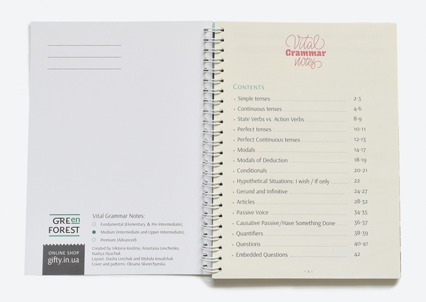 Vital Grammar Notes - це не просто блокноти, вони вмістили спеціальні граматичні таблиці, які розробили викладачі Green Forest. Маленькі та лаконічні конструкції стануть добрими помічниками для тих, хто вивчає англійську мову. Таблички містять правила та приклади. Вони відрізняються від таблиць у підручнику своєю простотою, наочністю та гарним дизайном. Для кого ці блокноти? Звичайно ж для студентів, викладачів, а також для всіх, кому цікава англійська мова. Крім табличок, блокноти містять дві секції із чистими листочками. Їх можна використовувати як під час навчання на курсах, так і щоденні блокноти.