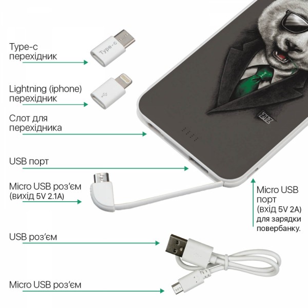 Характеристики товару Портативна батарея. Повербанк 10000mah Панда в піджаку