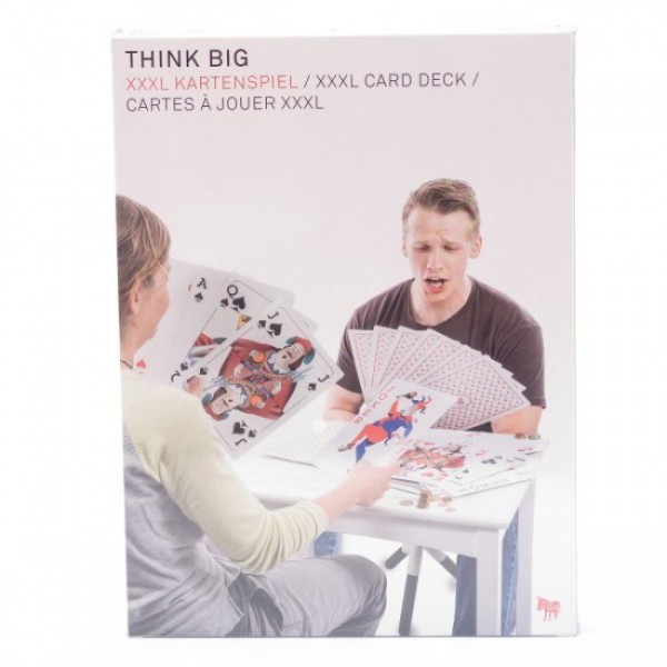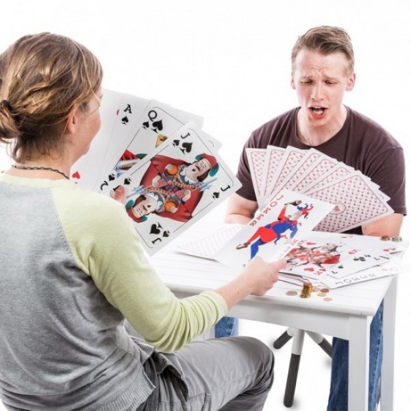 В даному випадку розмір карт прямо пропорційний кількості веселощів - уявіть себе або свого друга з величезними картами! Будь-яка партія перетвориться на веселощі, а гра в покер з цими картами буде неймовірно легкою - Ваші емоції ніхто за ними не побачить:) Більше того, купити колоду карт XXXL Card Deck можна не тільки для дорослих, але і для дітей - будувати величезний картковий будиночок дуже весело! Такі гральні карти купити можна зараз!