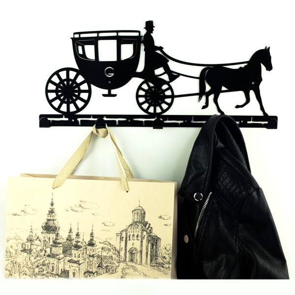 Казкова карета, запряжена кіньми, створює надзвичайну атмосферу в будинку. Лакей, керуючий візком, кам'яна бруківка – відлуння далекого минулого, які змушують уяву малювати всілякі сюжети та картинки. Прекрасна прикраса будинку для романтичних натур, яка ще й служить чудовою вішалкою для одягу. Завдяки точному лазерному різанню вішалка має безліч красивих елементів і дрібних деталей, а порошкове фарбування забезпечить довговічність виробу.