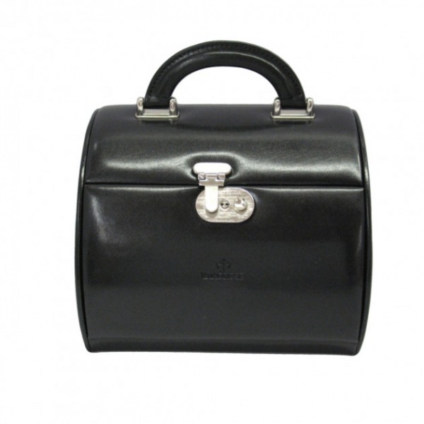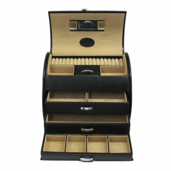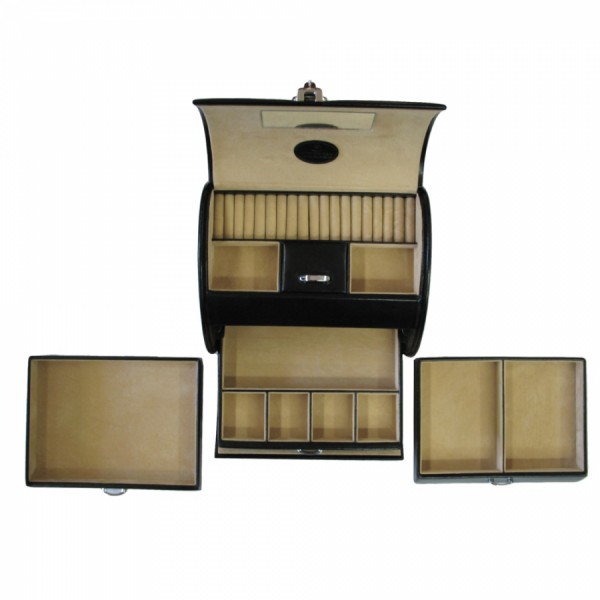 Скринька для прикрас з трьома ящиками, верхній рівень з валиками для зберігання кілець. На внутрішній стороні кришки дзеркало. Верхній рівень з валиками для кілець та трьома додатковими відділеннями. У передній частині три висувні скриньки: