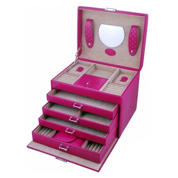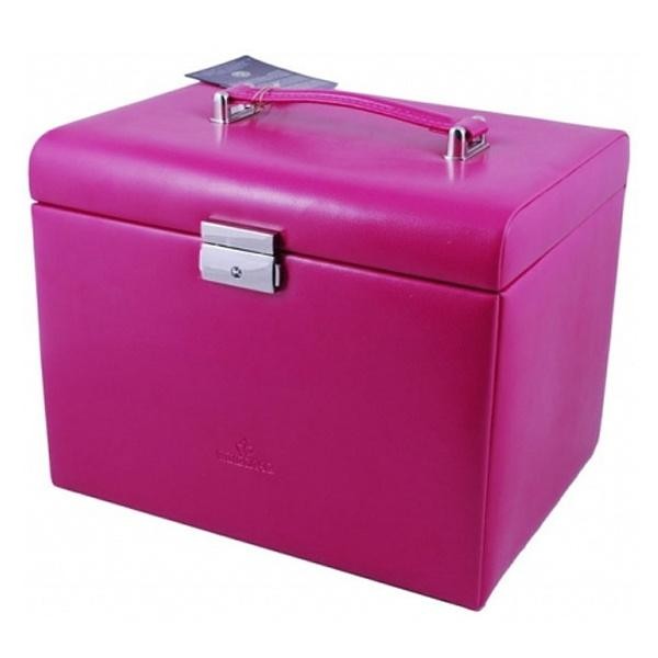 Велика скринька зі штучної шкіри, з величезною кількістю ярусів, відділень, відсіків. Відмінна риса – багато валиків для кілець, дорожній клатч для прикрас.