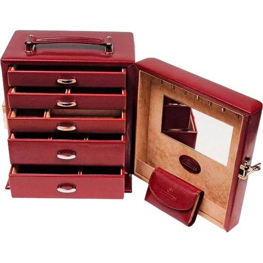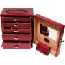 Скринька для прикрас. Усередині 5 висувних скриньок з валиками для кілець та відсіками для аксесуарів. На дверцятах дзеркало, тримачі для ланцюжків та додаткове відділення. Дорожній цей. Під відділеннями простора висувна скринька для зберігання прикрас та аксесуарів. Внутрішнє оздоблення – бежевий велюр. Закривається ключ.