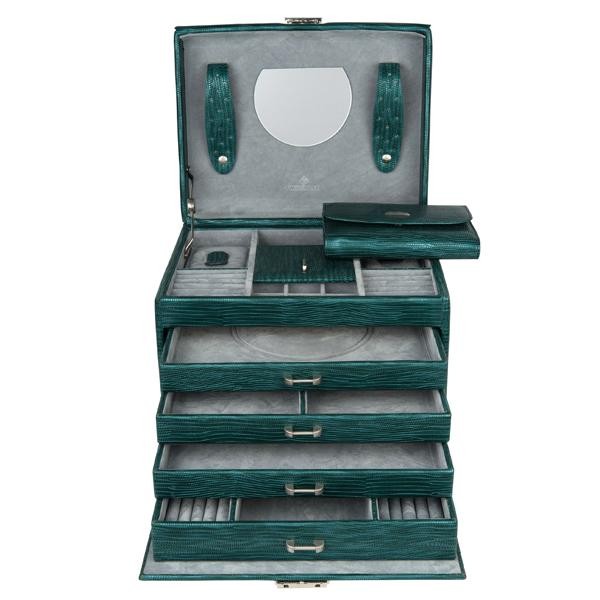 Лімітована серія скриньок для прикрас Lezard. Всередині основне відділення з валиками для кілець та відсіками для аксесуарів. 4 висувні ящики з відділеннями для зберігання прикрас та аксесуарів. На верхній кришці дзеркало та зручне кріплення для сережок. Скринька закривається на ключ.