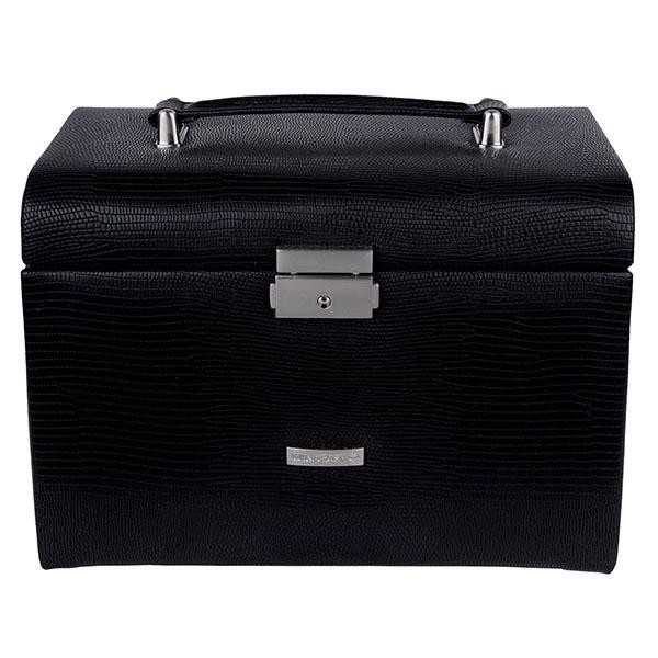 Лімітована серія Lezard. Футляр для прикрас. Всередині основне відділення з валиками для кілець та відсіками для аксесуарів. 3 висувні ящики з відділеннями для зберігання прикрас та аксесуарів. На верхній кришці дзеркало та зручне кріплення для сережок. Внутрішнє оздоблення – сірий велюр. Закривається ключ.