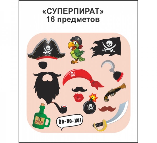 Набор для пиратской вечеринки, состоит из 16 предметов среди которых есть, даже, попугай. В наборе 16 предметов.