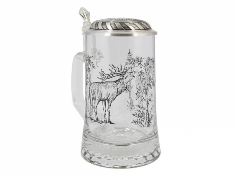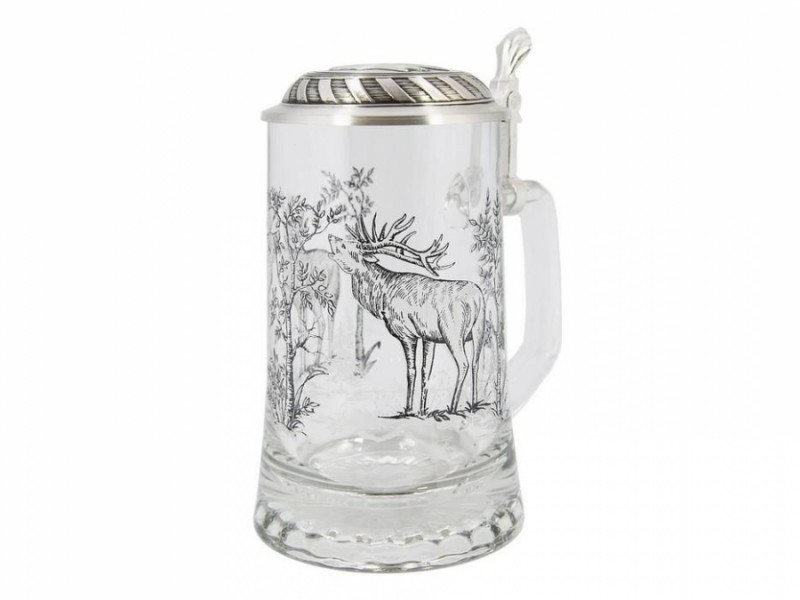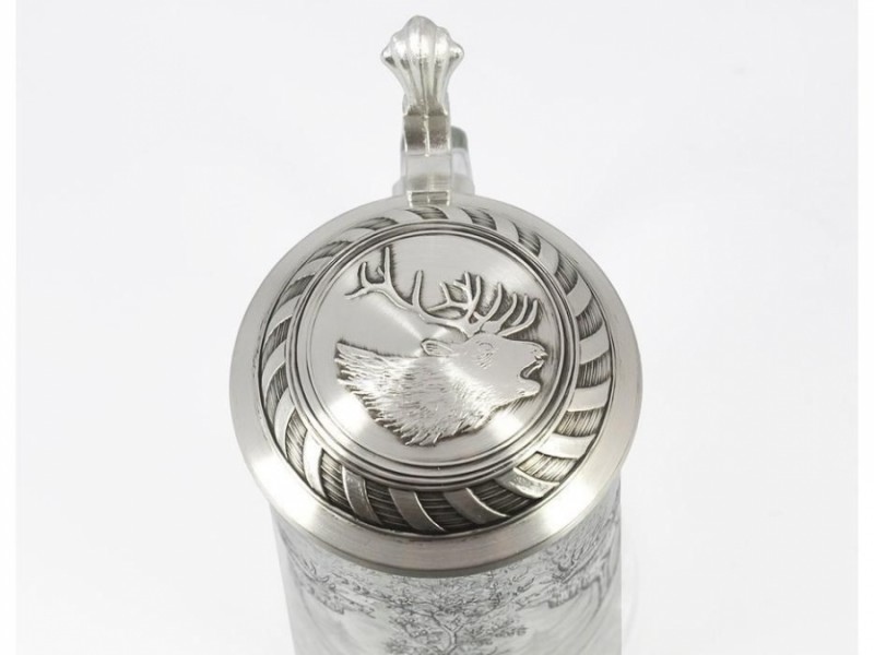 Сюжет декору присвячений темі полювання – на стінках скляного келиха ми бачимо лісових оленів. Кришка виробу виконана з харчового олова високої якості, не окислюється, прикрашена гравюрою. Знавці стверджують, що саме наявність кришки гарантує те, що пиво не видихнеться при тривалих та захоплюючих бесідах за келихом пива.