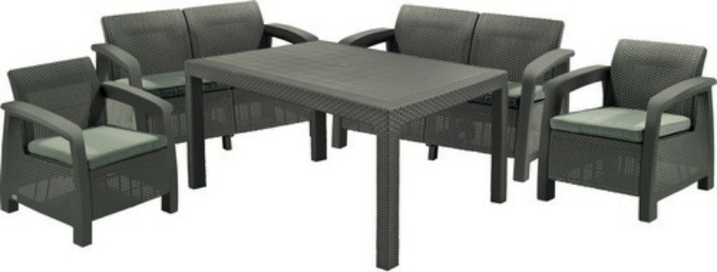 Bahamas Fiesta - це комплект меблів, до складу якого входять два крісла, дві двомісні лавки та великий прямокутний стіл. Комплект ідеально виконує функцію меблів, призначених для їди. Такий комплект ідеально підійде для меблювання великого простору, чудово підходить для організації сімейного грилю або вечірки у саду. Має міцність і стійкість до впливу несприятливих погодних умов та УФ-променів. Bahamas Fiesta пропонується в елегантній кольоровій гамі. Легко чиститься, просто збирається.