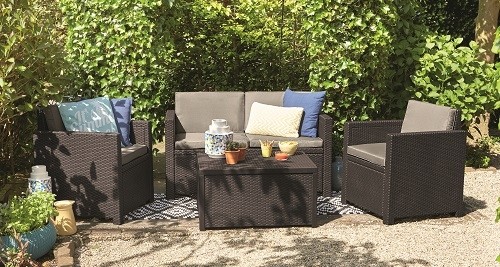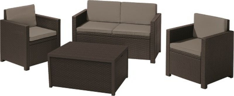 Абсолютний хіт від компанії Keter комплект меблів для дачі Maui lounge set (Modena). Звичайний стіл замінений столом-скринею, в якому ви можете зберігати все, що необхідно. Невеликий двомісний диван з двома кріслами та столиком складають комплект садових меблів, який може бути встановлений як на відкритому майданчику, так і у приміщенні. Завдяки своїм невеликим розмірам комплект може бути використаний як меблі для балкона чи кафе.