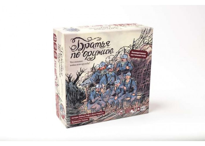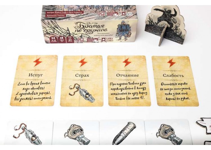 Настільна гра Брати зі зброї розрахована на 2 – 5 гравців, де кожен виступає у ролі солдата. До речі, персонажі гри – такі ж звичайні реальні люди, як і ви, але з однією відмінністю – вони жили та воювали за часів Першої світової війни. Не переживайте, воювати по-справжньому, брати в руки зброю, кидати гранати, керувати винищувачем або продумувати стратегію та виробляти тактику ведення бою в настільній грі Брати зі зброї вам не доведеться. Головне завдання – спільно дістатися живими до закінчення війни.