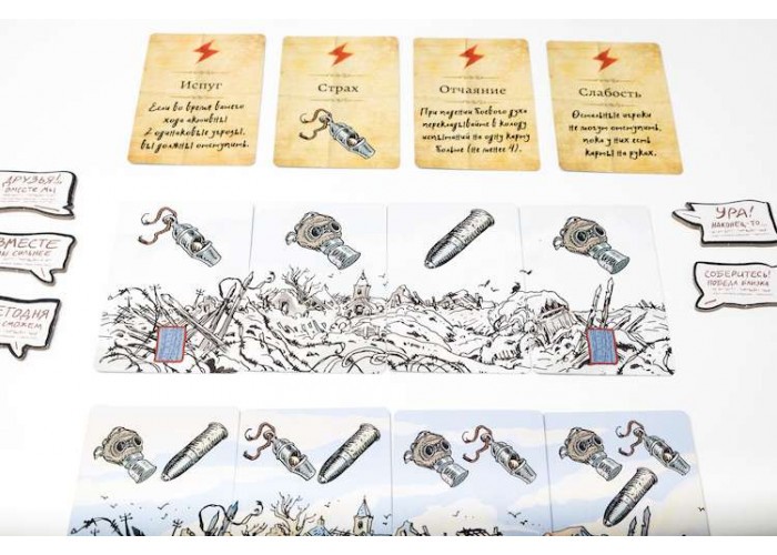 Перед початком гри учасники отримують свою карту солдата з індивідуальними талісманами та по 3 жетони постачання. 25 карт розташовуються на карті перемир'я і є колодою випробувань, інші розміщуються на карті меморіалу і уособлюють бойовий дух вашого загону.