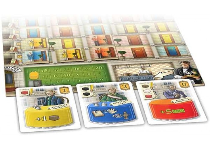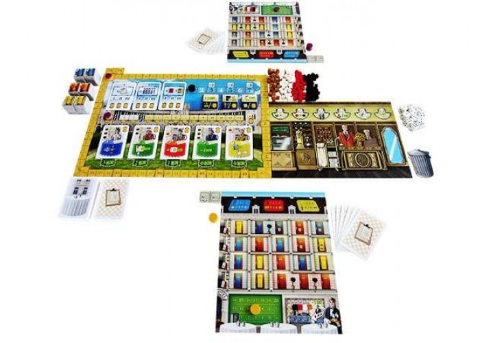 Всі процеси відображатимуться на двосторонньому ігровому планшеті із зображенням готелю у чотири поверхи та власного кафе. Зелена область планшета відображатиме ваш фінансове становище.