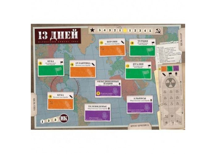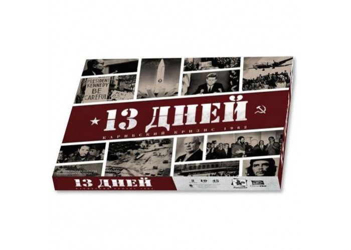 Настільна гра 13 днів: Карибська криза – це нескладна дуельна карткова стратегія, створена на основі історичного протистояння США – СРСР. Ядерна війна – зло світового масштабу, а щоб його не допустити, ви повинні піднятися в очах інших держав як мудрий політик і не допустити зі свого боку знищення супротивника найбруднішим шляхом.