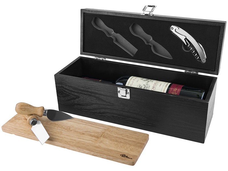 Набір Mino для вина та сиру. Коробка для вина зі штопором та дерев'яна дошка з двома ножами для сиру. Вино та сир не входять у набір. Набір упакований у дерев'яну коробку, шильд для персоналізації входить у комплект. Дерево та нержавіюча сталь.