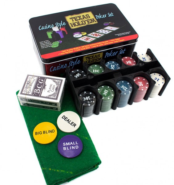 - фішка дилера; сукно; карти; фішка smal blind; фішка big blind