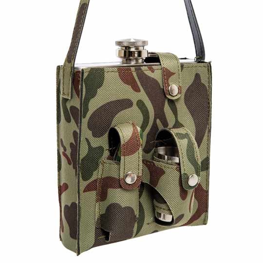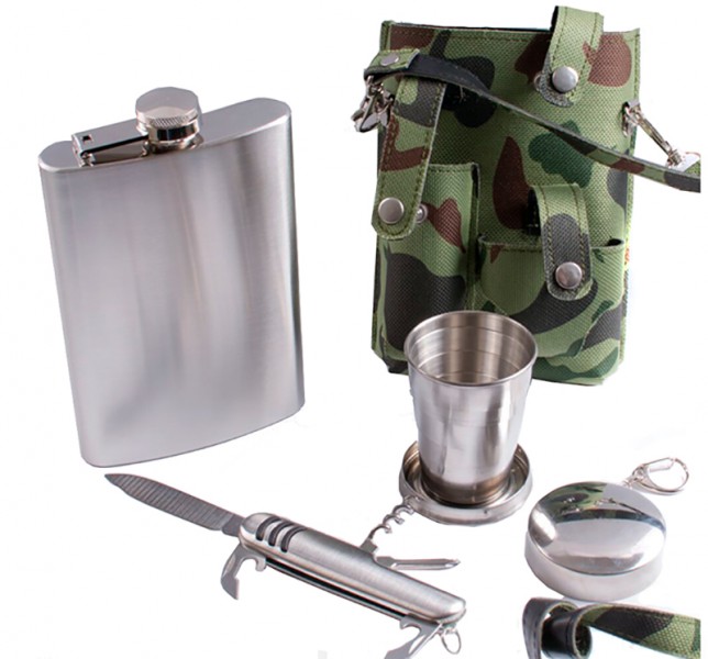 Відмінний подарунковий набір у камуфляжній сумці, що складається з металевої фляги, трьох стопок та складаного складаного ножа з невеликим компасом!