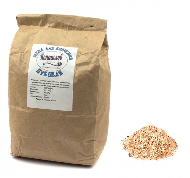 Велика упаковка тирси з бука підходить для копчення практично всіх продуктів, після копчення продукт набуває золотистого кольору і має приємний смак і аромат. Фракція: 8-12мм. Вологість 10-12%. Вага упаковки 1 кг.