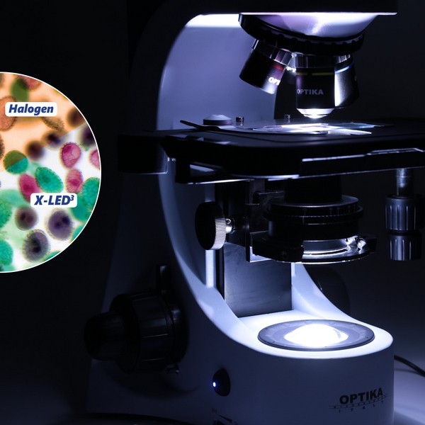 Оптическое разрешение в большей степени зависит от правильности освещения. Современная оптика микроскопов настолько совершенна, что сложно изобрести что-то революционно новое, в то время как скачок развития светодиодных технологий открывает широкие возможности в микроскопии. Компания Optika представляет следующий шаг в усовершенствовании освещения – профессиональное предметное светодиодное освещение X-Led3. Высокоэффективный светодиод мощностью 3,6W создает необходимый световой поток для полного освещения контрастных образцов при максимальных увеличениях (эквивалентно галогенной лампе мощностью 50W). Светодиод совмещен с рефлектором сложной геометрии и специально спроектированной оптической линзой, что позволяет значительно улучшить интенсивность, однородность и направленность производимого света. В отличии от традиционных галогенных ламп, световой поток, получаемый при использовании системы X-Led3 обладает ярким белым свечением со световой температурой 6300К, что соответствует естественному дневному освещению. Таким образом, изображение лишено излишне-желтой окраски светом галогенной лампы. Вместе с тем светодиод чрезвычайно экономичен в сравнении с галогенной лампой аналогичной яркости, как в отношении расхода энергии (потребляет на 90% энергии меньше), так и в отношении срока службы (65 000 часов по сравнению с 1 500 часов работы).