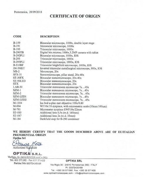 Вся продукція Optika SRL виготовлена в Італії. У невеликому містечку Понтераніка (провінція Бергамо) здійснюється розробка, виробництво та збирання мікроскопів Optika. Кожен мікроскоп супроводжується індивідуальним серійним номером, вказаним на корпусі та гарантійному талоні, а також відміткою про проходження кінцевого контролю якості. Усі вироби відповідають основним вимогам відповідних європейських директив ЄС та стандартам Європейського Союзу.