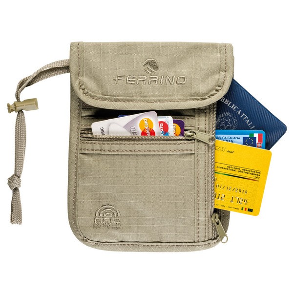 Ferrino Anouk Neutral - спеціальна потайна сумка для документів, яка дозволяє в походах, поїздках зберігати паспорти, банківські картки, ключі, смартфон та гроші при собі, а також захистити банківські картки чи електронний пристрій від крадіжки грошей та інформації за допомогою RFID-захисту. Сумка дуже тонка, її легко можна носити під одягом. Оскільки сумка може контактувати зі шкірою - для її виробництва обраний натуральний екологічний матеріал - бавовна, а зворотна сторона зроблена сітчастою. Матеріал досить міцний, оскільки має структуру переплетення ripstop. Сумка має зовнішнє гідрофобне просочення, що підвищує захищеність речей від промокання. Наший шнурок плоский і порожнистий, завдяки чому не натирає шию. Його довжина регулюється фіксатором. Сумка має чотири кишені, в яких без проблем можна розмістити паспорт, шестидюймовий смартфон та інші важливі дрібниці.