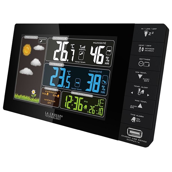 Метеостанція з контрастним кольоровим РК-дисплеєм, прогнозом погоди на найближчі 12 годин, вимірюванням внутрішньої та зовнішньої температури та відносної вологості та USB-портом для заряджання мобільних пристроїв.