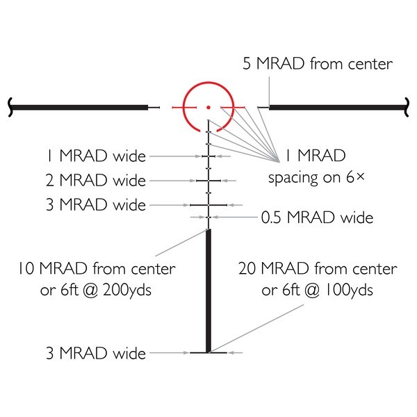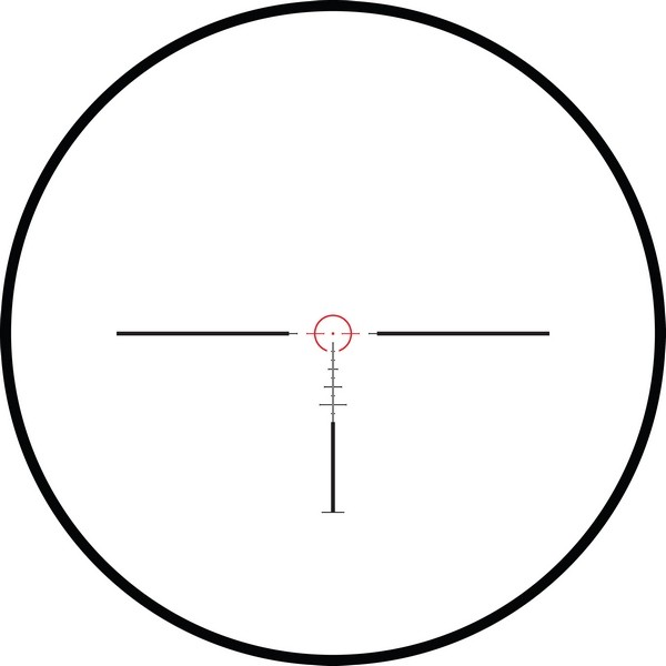 Tactical IR Dot - це нова тактична сітка, що дозволяє вести швидкісну прицільну стрілянину на коротких та середніх дистанціях. Відстань між бічними лініями сітки становить 10 MRAD, що є зручним для попереднього швидкого прицілювання. Центральне коло, що підсвічується, має діаметр рівний 5 MRAD для більш точного прицілювання, особливо в умовах зниженої видимості. Додаткові перехрестя зручні для стрілянини на середні дистанції. Усі розміри цієї сітки правильні при максимальному 6-кратному збільшенні. Персональну адаптацію сітки під конкретну зброю та тип снаряду дозволить здійснити безкоштовний балістичний калькулятор X-ACT