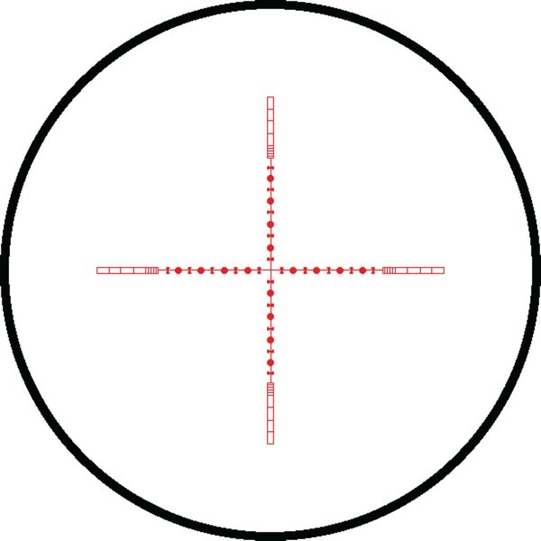 10х 1/2 Mil Dot IR - удобная универсальная сетка для максимально точного прицеливания на различных расстояниях. Главное отличие от обычной прицельной марки Mil Dot состоит в том, что тут имеются дополнительные пересечения, отмечающие пол мила. Все компоненты этой сетки имеют строго регламентированные размеры, расстояния между всеми элементами также регламентированы. Благодаря этому не проблема определить расстояние до цели либо размеры цели, приняв при этом правильную поправку на ветер и определить траекторию падения пули. Данный 1/2 Mil Dot верен при 10-кратном увеличении. Для других увеличений линейные и угловые размеры определяются методом интерполяции, либо по специальным таблицам. Персональную адаптацию сетки под конкретное оружие и тип снаряда позволит совершить бесплатный баллистический калькулятор X-ACT
