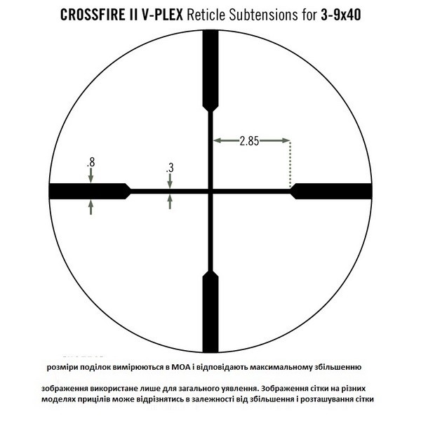 Маючи збільшену фокусну відстань вихідної зіниці, механізм швидкого фокусування Fast Focus, повне багатошарове просвітлення оптики і барабани введення поправок, що обнулюються, даний приціл сконструйований без компромісів і за своїми характеристиками залишає далеко позаду більшість аналогічних моделей у своїй ціновій категорії. Міцний монолітний корпус з авіаційного алюмінію з анодованим покриттям захищений від подряпин, вологи, пилу та запотівання. Перехрестя класичної прицільної мисливської марки гранично тонке і не перекриває мету під час прицілювання. Приціл Vortex Crossfire II 3-9x40 (V-Plex) рекомендований для мисливців-стрільців на середні дистанції із нарізної зброї патронами центрального бою та кільцевого займання калібром до .308 WIN включно.